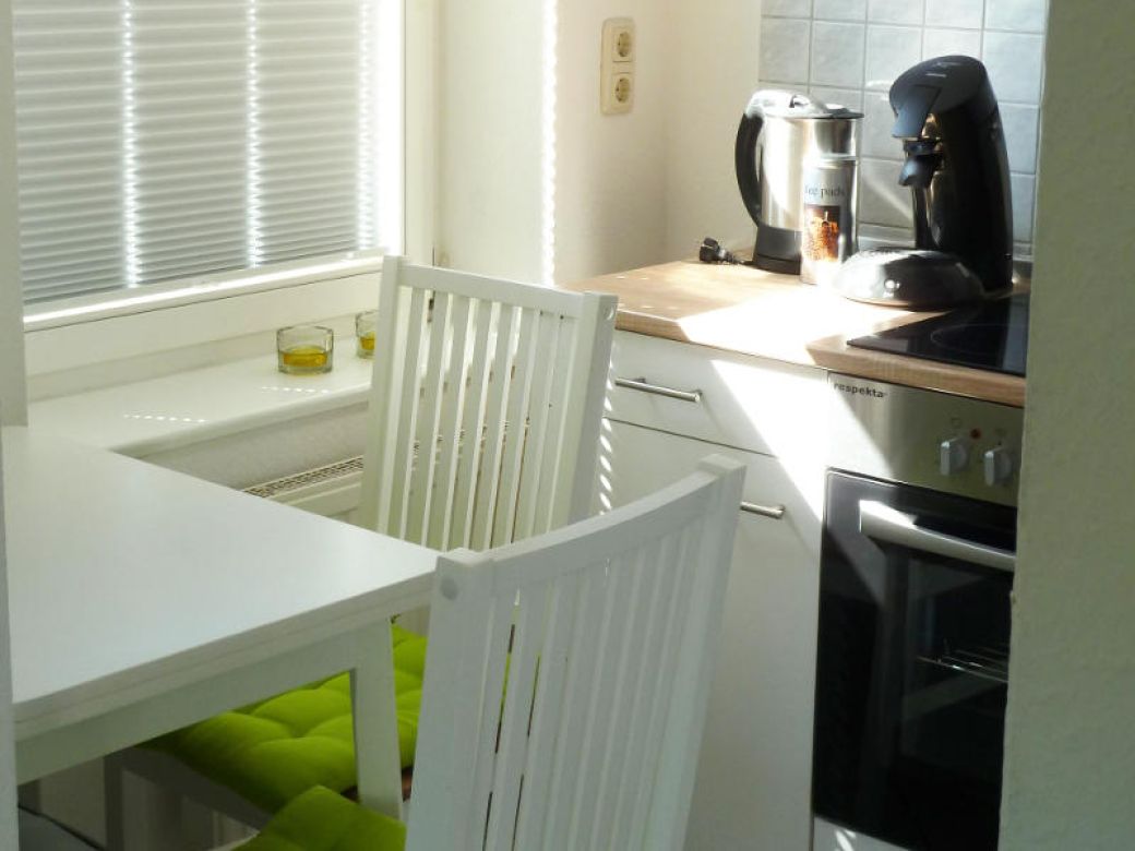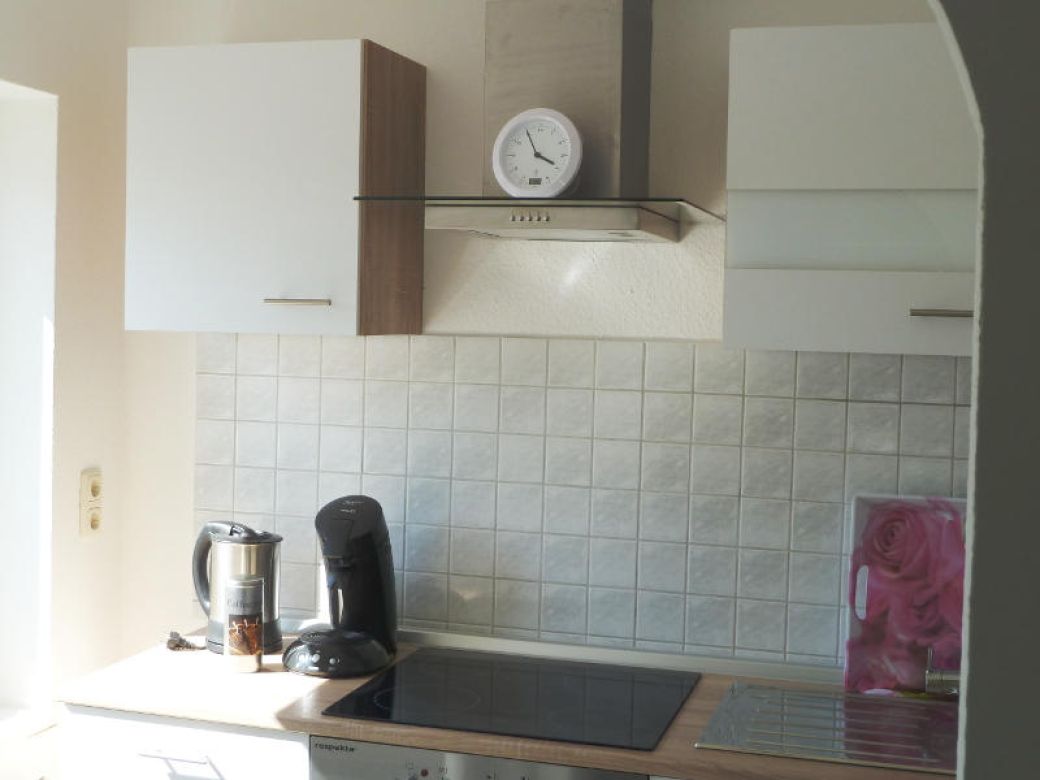 moderne Küche mit allen notwendigen Geräten (Mikrowelle, Ceranfeld, Senseo-Kaffeemaschine, Kühlschrank mit Gefrierfach, etc.)