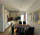 moderne Küchenzeile mit Kühlschrank/Gefrierfach, Spülmaschine, Toaster, Kaffeemaschine, Wasserkocher, Mikrowelle, Mixer, Fön, Bügeleisen und Bügelbrett