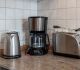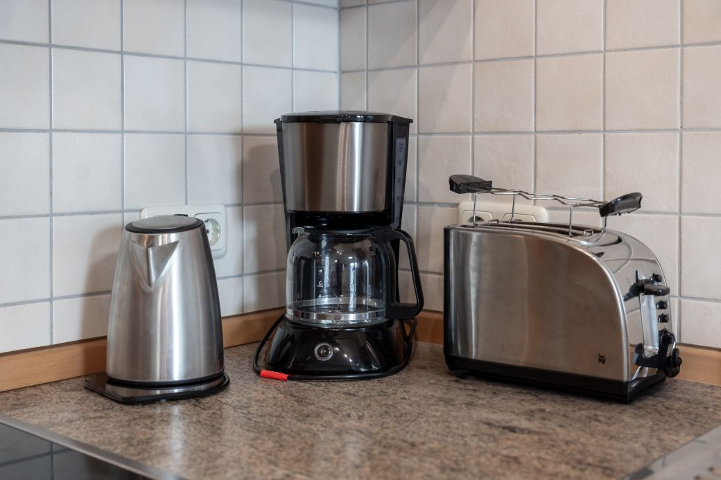 moderne Küchenzeile mit Backofen, Kühlschrank und Gefrierfach, Spülmaschine, Toaster, Kaffeemaschine, Wasserkocher, Mikrowelle, Mixer, Fön, Bügeleisen und Bügelbrett.