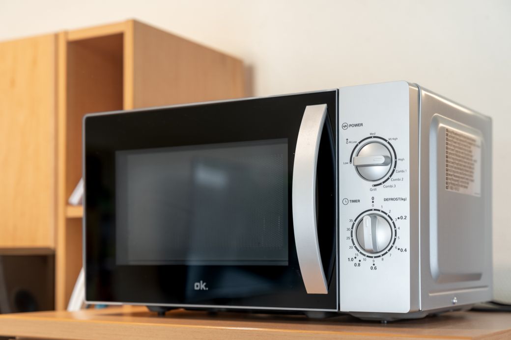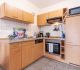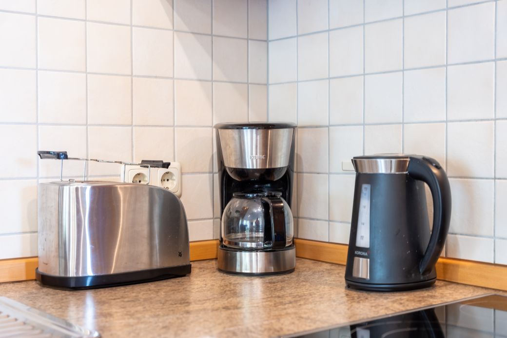 moderne Küchenzeile mit Backofen, Kühlschrank und Gefrierfach, Spülmaschine, Toaster, Kaffeemaschine, Wasserkocher, Mikrowelle, Mixer, Fön, Bügeleisen und Bügelbrett