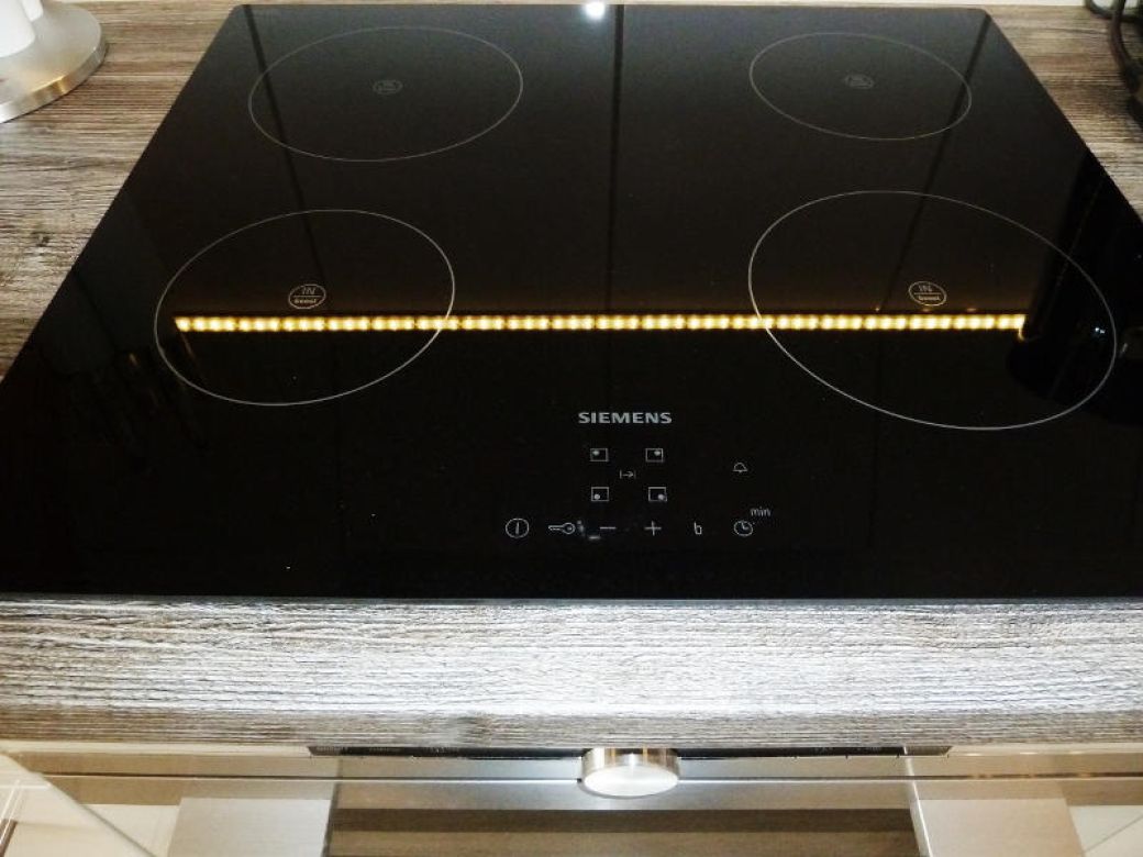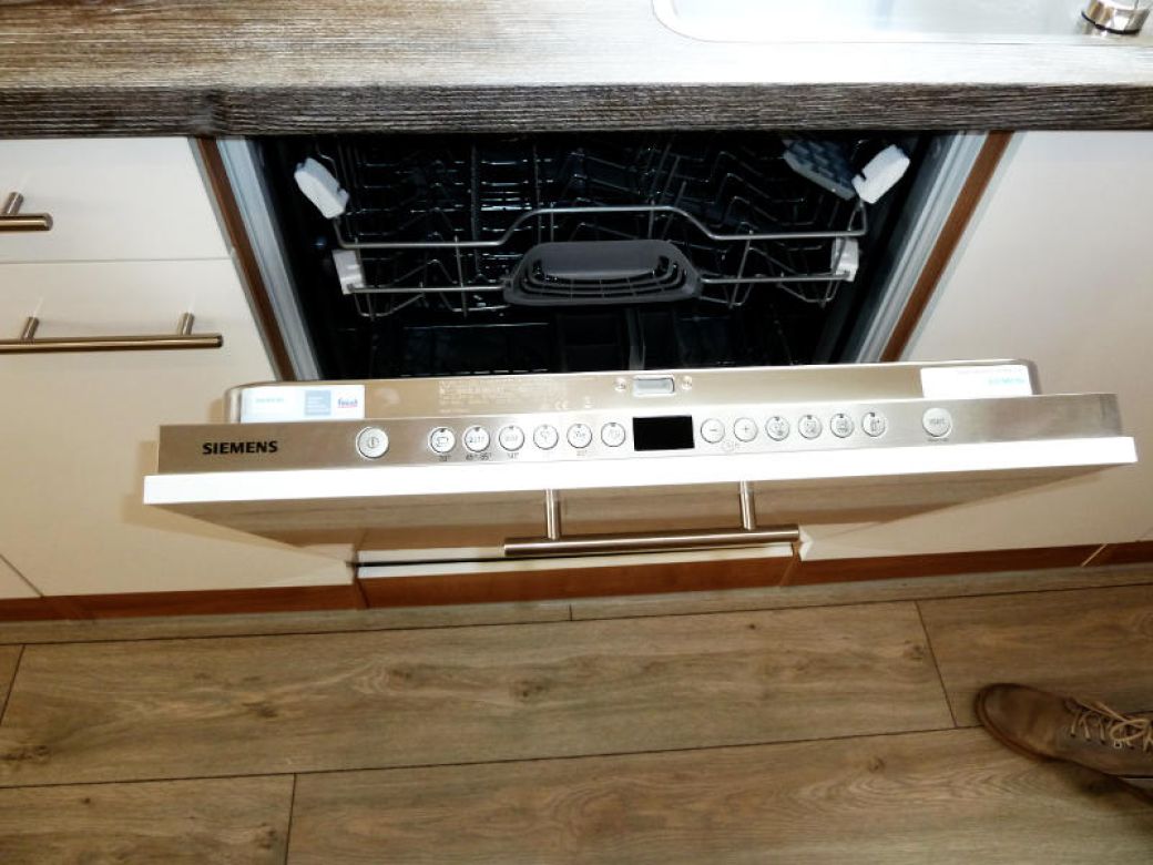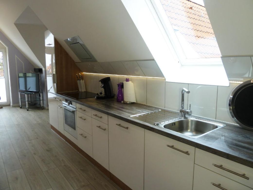 moderne offene Küche mit allen notwendigen Geräten (Kühlschrank mit Gefrierfach, Induktionsherd, Backofen, Spülmaschine, Mikrowelle, Kaffeemaschine, Senseo- Kaffeemaschine, Eierkocher, etc.)
